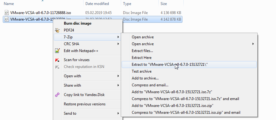 После скачивания iso с vCenter у нас как минимум 2 варианта: примонтировать .iso через ESXi к машине администратора или с помощью архиватора извлечь содержимое .iso файла в соседнюю папку.