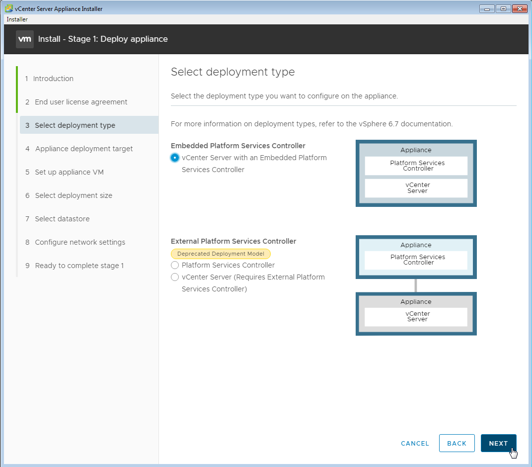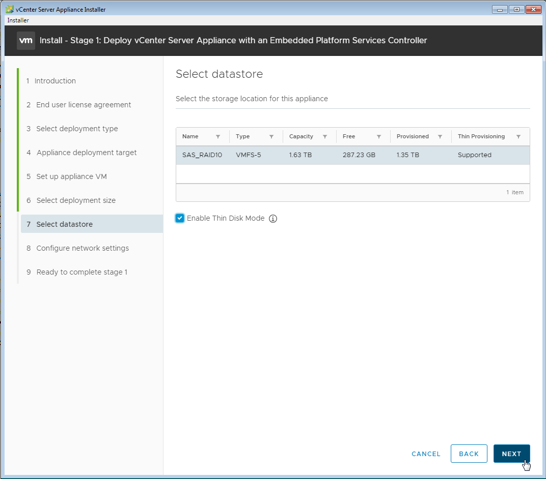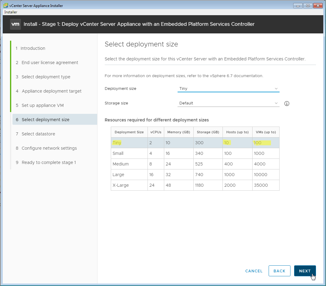 В зависимости от количества ESXi хостов и количества виртуальных машин выбираем размер vCenter.