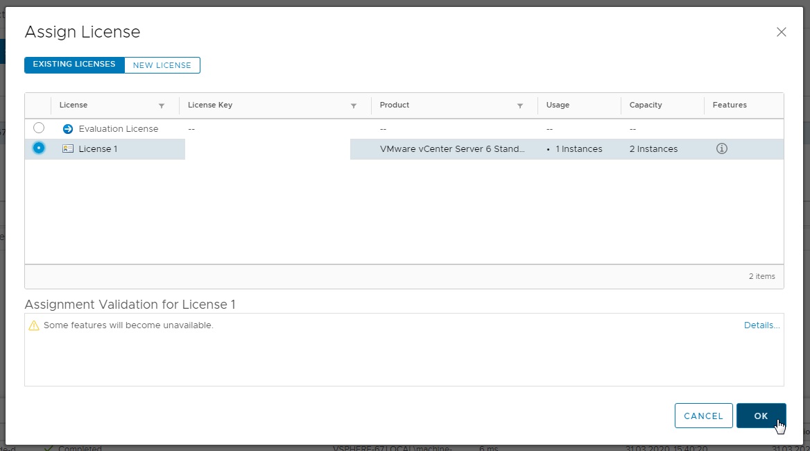 Для этого меню Assets → Assign License и выбираем vCenter, к которому нужно применить лицензию.