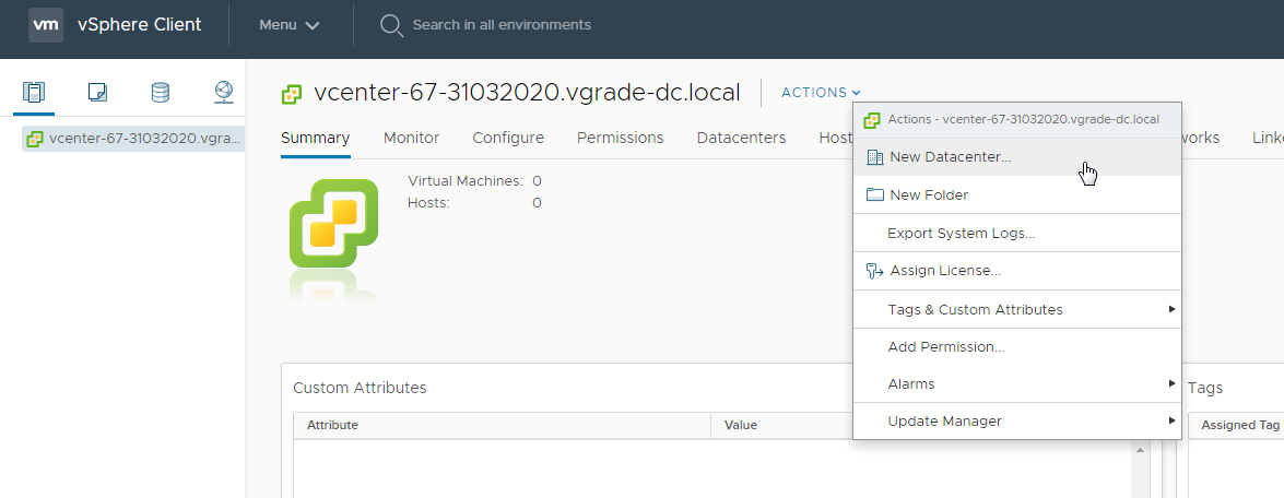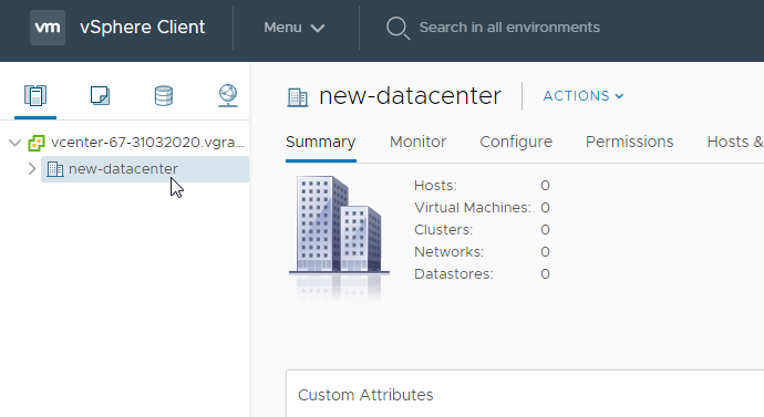 В Actions выбираем New Datacenter. В этот датацентр будут позже добавлены ESXi.