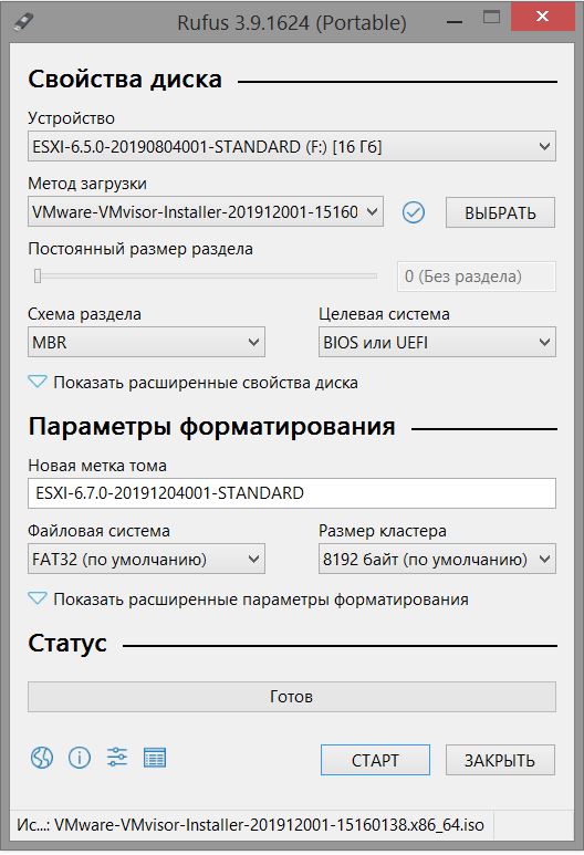Выбираем устройство - USB flash и метод загрузки - наш загруженный iso образ ESXi.